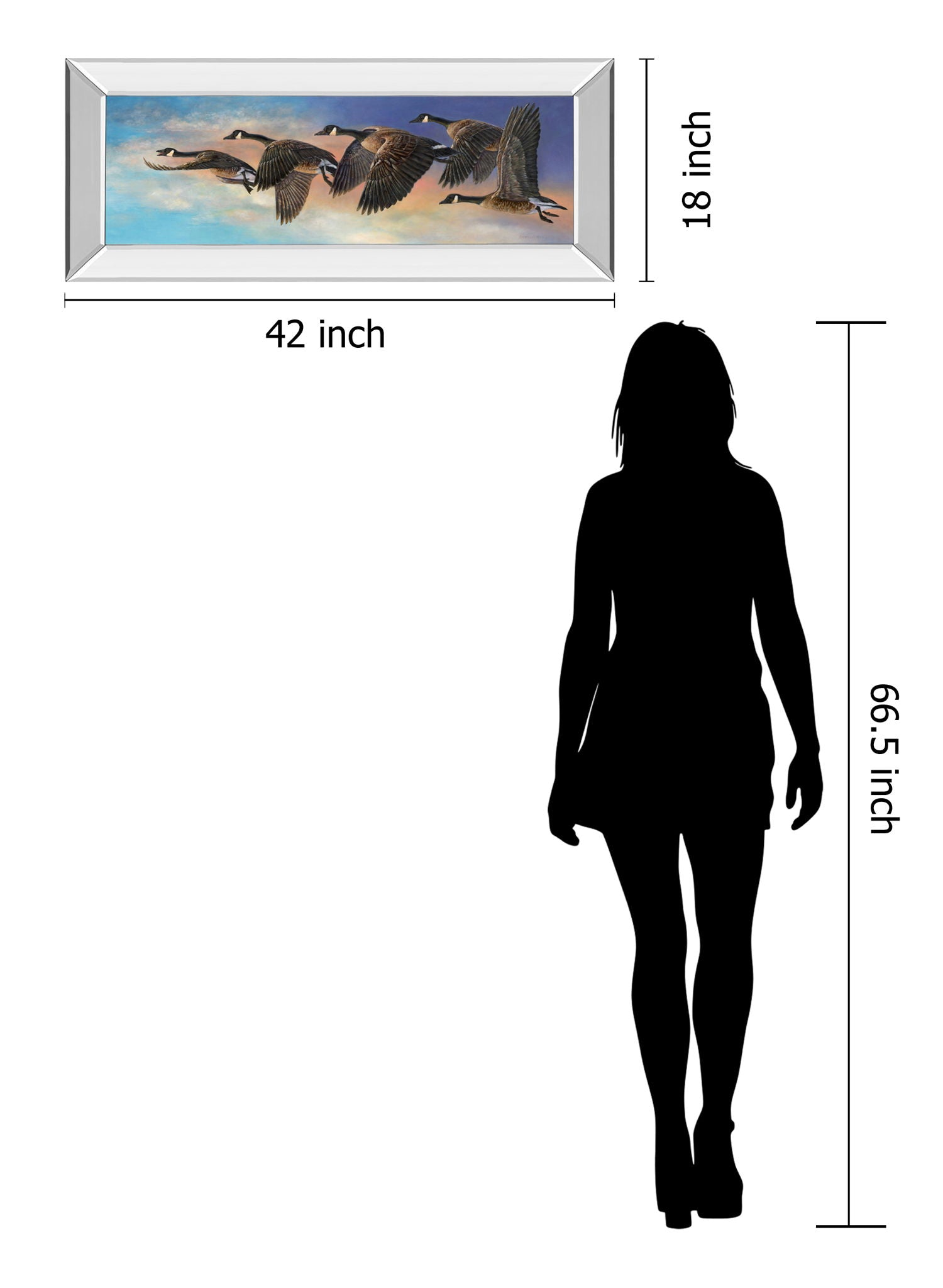 Experience the tranquil beauty of nature with this captivating depiction of geese in flight. Set against a serene sky painted in soft blues and warm sunset tones, the artwork captures the elegance and freedom of these birds mid-air. The mirrored frame adds a contemporary edge, reflecting light to enhance the rich colors and intricate feather details. Crafted with premium real glass and meticulous attention to detail, this piece brings a harmonious blend of traditional charm and modern sophistication to any living room or office space, inviting calm and inspiration into your environment.
