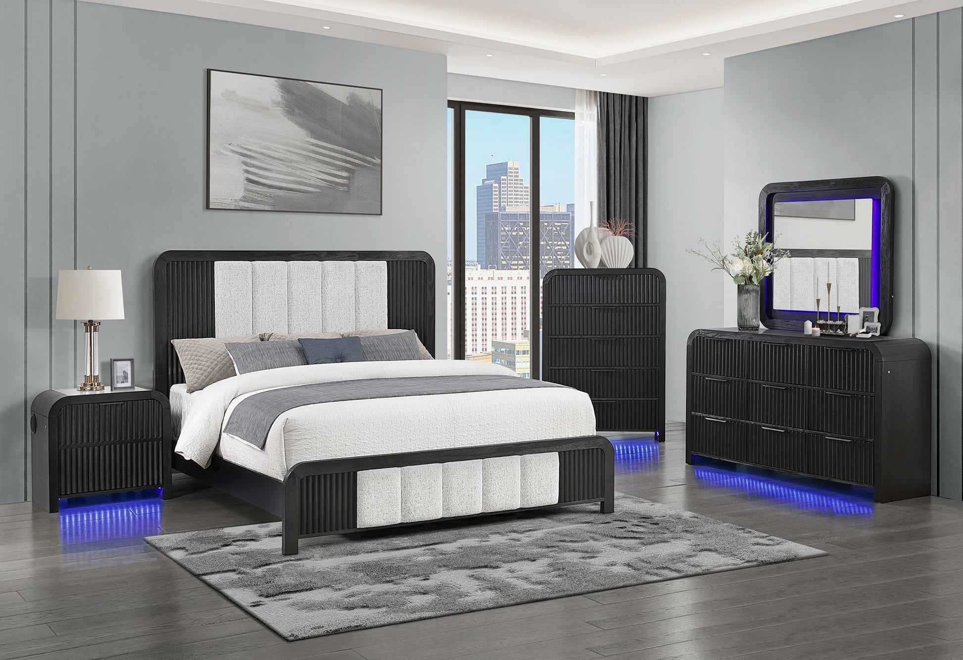 Contemporary design meets smart functionality in the Beckett Black Bedroom Collection by Global Furniture. This bold collection is finished in a deep black tone, accented by soft white upholstery on the headboard and footboard, and elevated with fluted detailing for added texture and dimension. The dresser, chest, and nightstands all feature white faux marble tops that offer a clean, luxurious contrast, while fluted drawer fronts add depth and a sophisticated visual rhythm. Integrated LED lighting across all case goods enhances the atmosphere with a subtle glow. Choose from multiple nightstand options, including versions with built-in speakers and even a cooler'' complete with a snack drawer and pull-out tray. The Beckett Collection brings a refined, modern aesthetic with practical features for today's lifestyle.