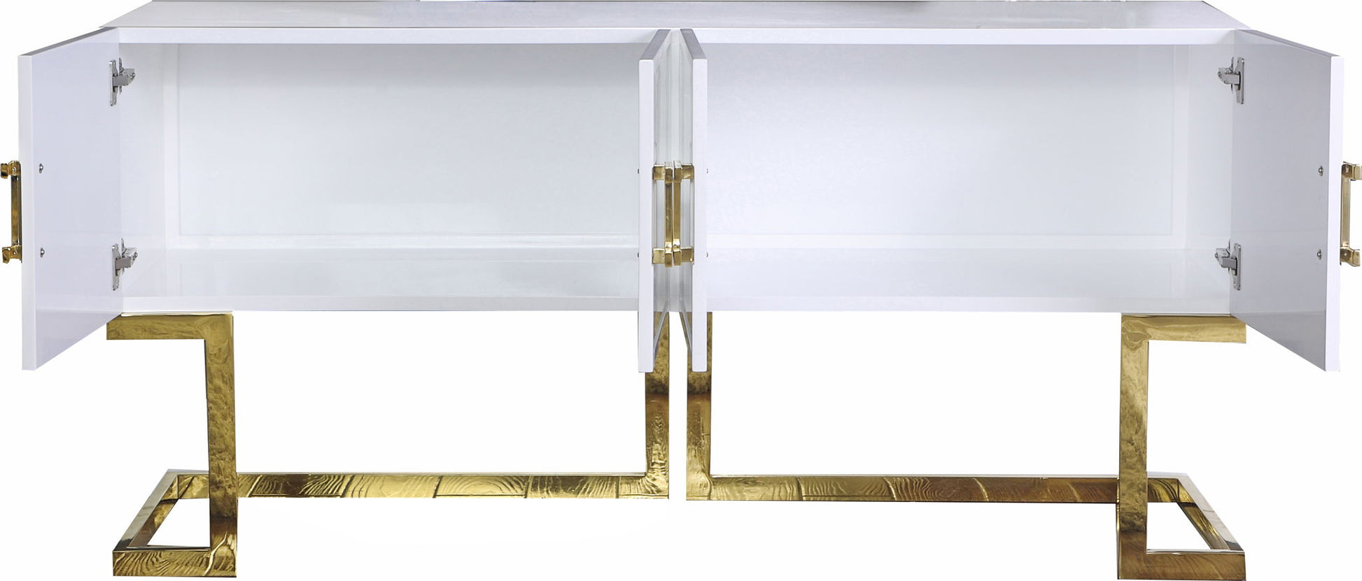 Ensure the items you need at mealtime are close at hand with this handsome Beth Sideboard Buffet from Meridian Furniture. This indispensable piece is a modern marvel with its contemporary design featuring lacquer with a stainless steel trim and base. Open the doors to reveal a large area that's suitable for storing everything from serving bowls to out-of-season dinnerware.