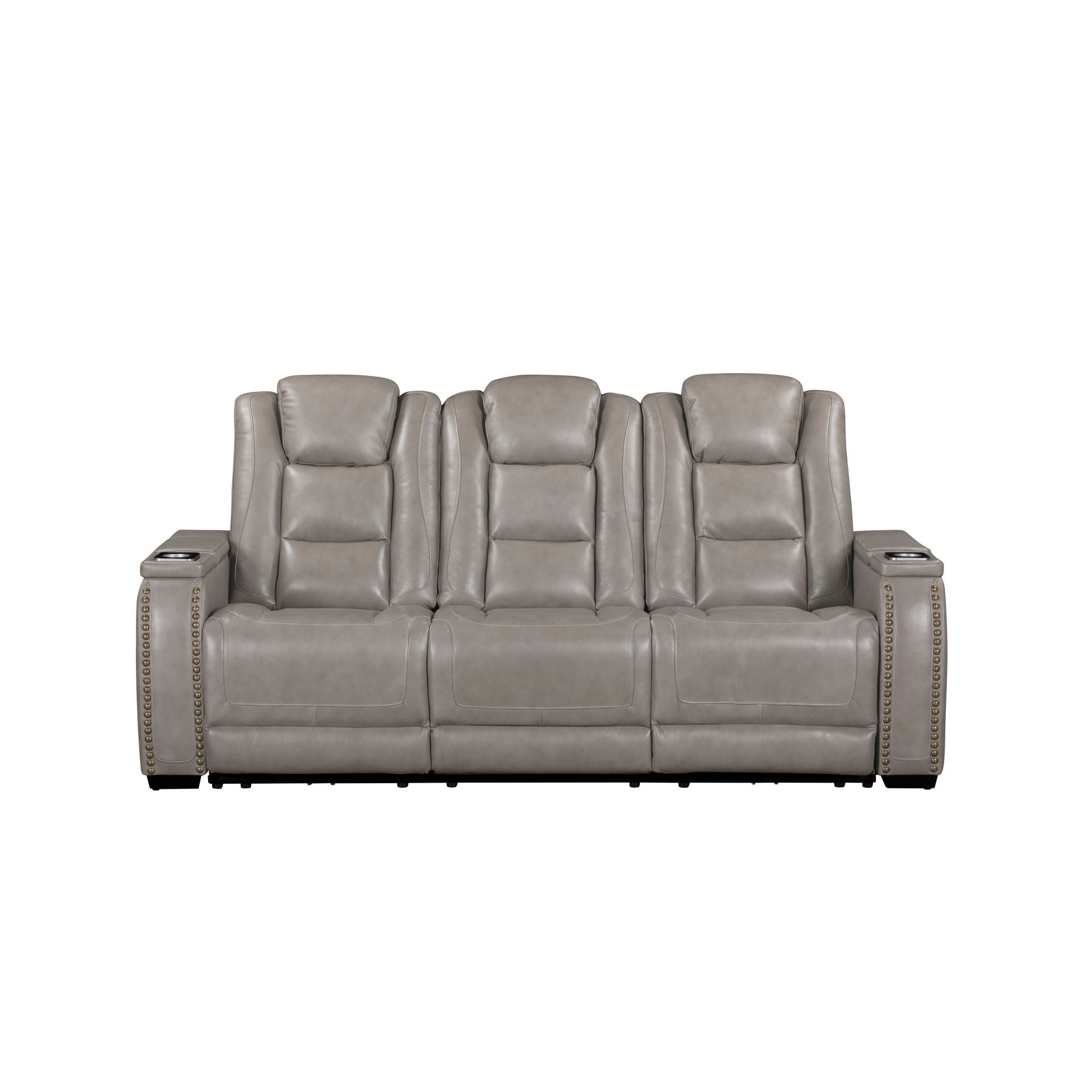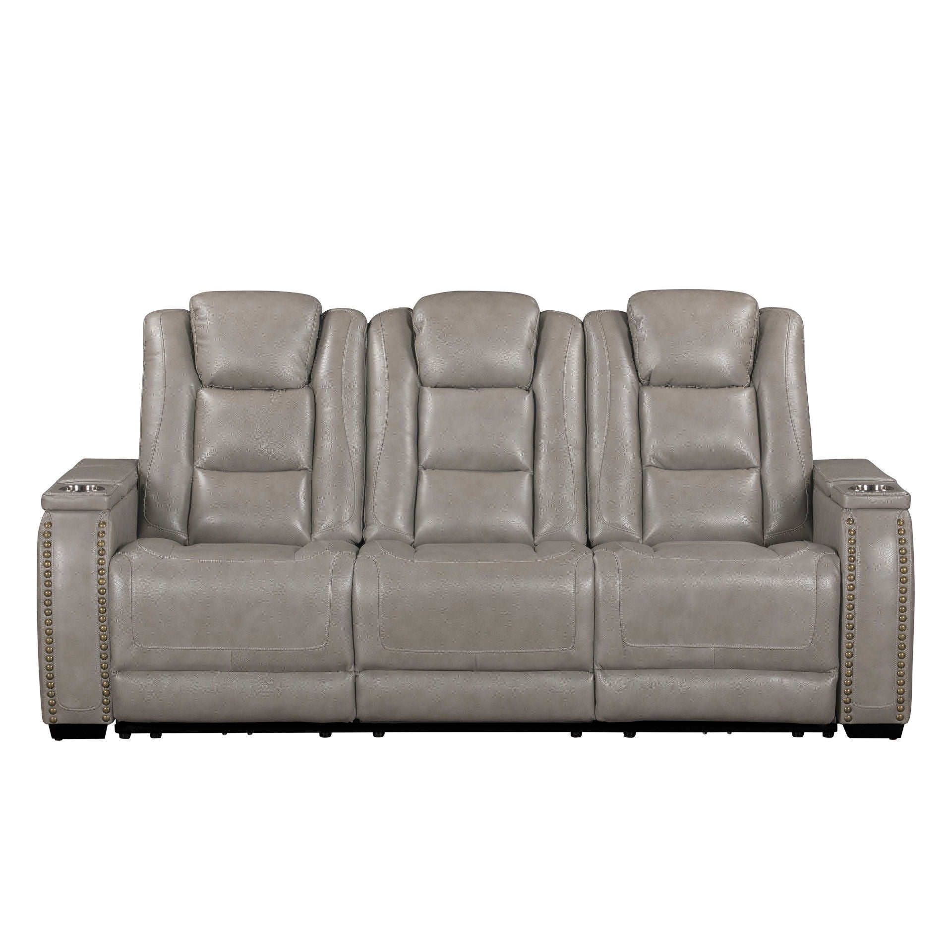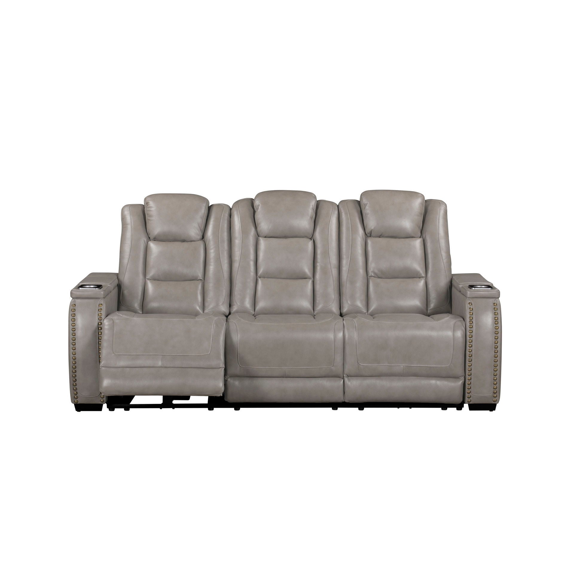 The Breckenridge Genuine Leather Reclining Sofa offers a perfect combination of luxury, durability, and modern convenience, making it an ideal centerpiece for your living space. This reclining sofa is crafted with a blend of hardwood and manufactured woods, ensuring a sturdy and durable frame that provides long-lasting support and reliability. The top-grain leather on the seats, arms, and footrests delivers a luxurious feel, while a matching leather-like material in less-touched areas keeps it affordable without compromising on style or comfort. The design features clean lines and elegant nailhead trim, blending traditional and contemporary elements for a refined, transitional look. Pocket coil seat cushions provide superior comfort with targeted support, minimizing pressure points for a tailored seating experience. The reclining seats allow you to easily find your perfect position for lounging or reading. This sofa is also packed with convenient features, including cupholders integrated into the armrests. Additionally, the sofa includes a drop-down tray, electrical outlets, and reading lights, making it a functional and stylish addition to any home.
