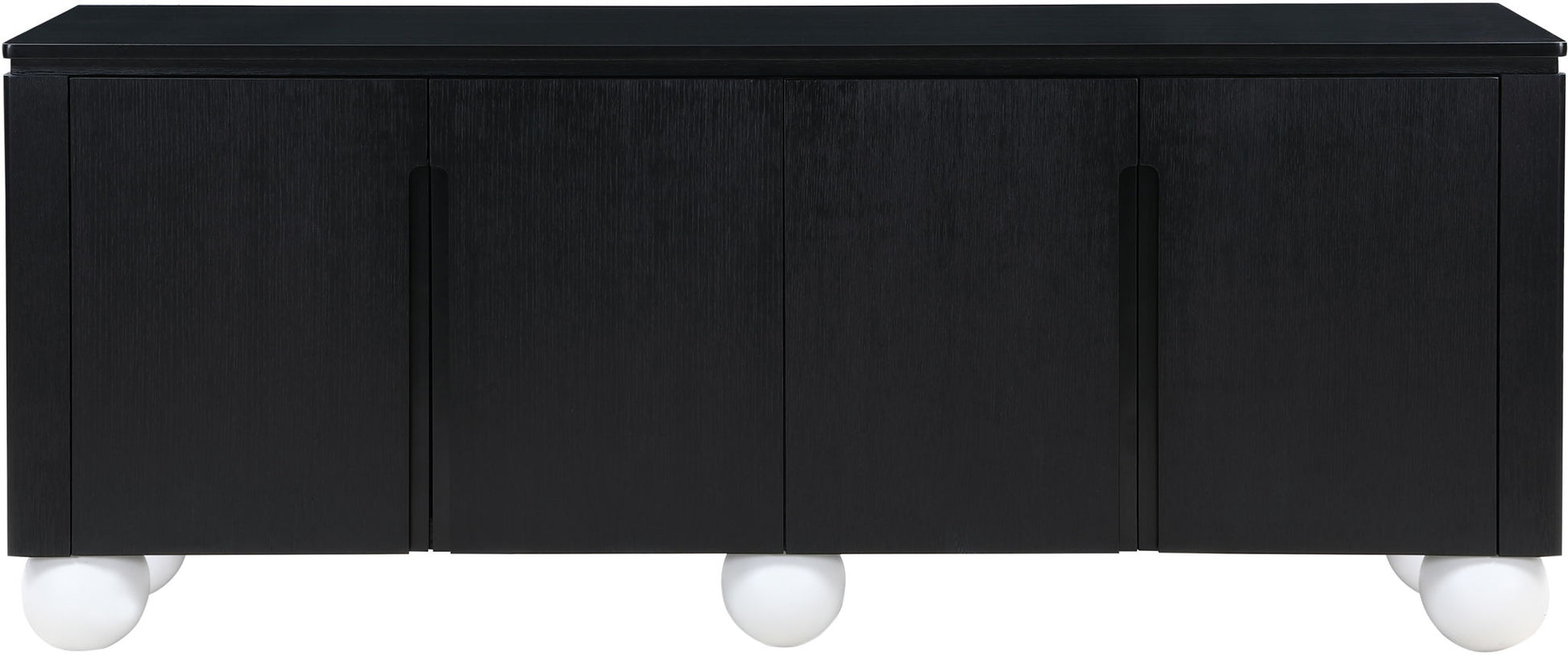 Transform your dining space into a haven of modern elegance with the Cardiff Black Sideboard Buffet. Featuring a rich oak finish contrasted with white lacquer legs and a lacquer top, it creates a sleek and modern aesthetic. Crafted mostly from solid wood with oak veneer made from rubberwood, as well as some parts made from MDF plywood, it boasts natural wood grain variation for added charm. This versatile piece serves as an elegant storage solution and a stylish platform for decorations. With doors designed to conceal cutlery, dishes, napkins, and dining supplies, it ensures your dining area stays organized and clutter-free. Elevate your dining experience with this handsome sideboard buffet that meshes practicality and sophistication effortlessly.