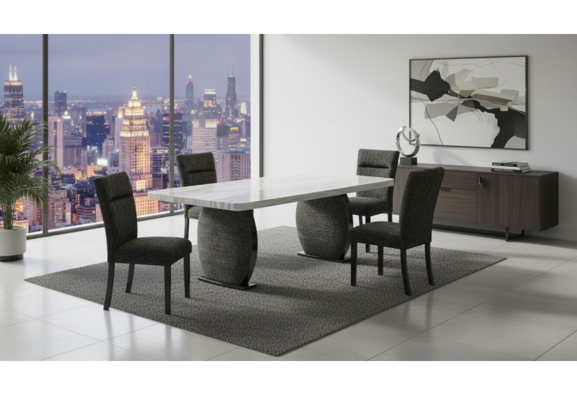 Create a striking focal point in your dining space with the D2502 Dining Table and Dining Chair set by Global Furniture USA. The table showcases a sophisticated grey faux marble top that adds a sleek modern touch, while its curved base legs feature an eye-catching glitter texture that brings contemporary elegance and visual interest. Coordinating beautifully with the table, the D2502 chairs are upholstered in a rich blend of black and grey fabric, providing both stylish contrast and comfortable seating. Together, this set delivers refined style and everyday functionality that elevates any dining room.