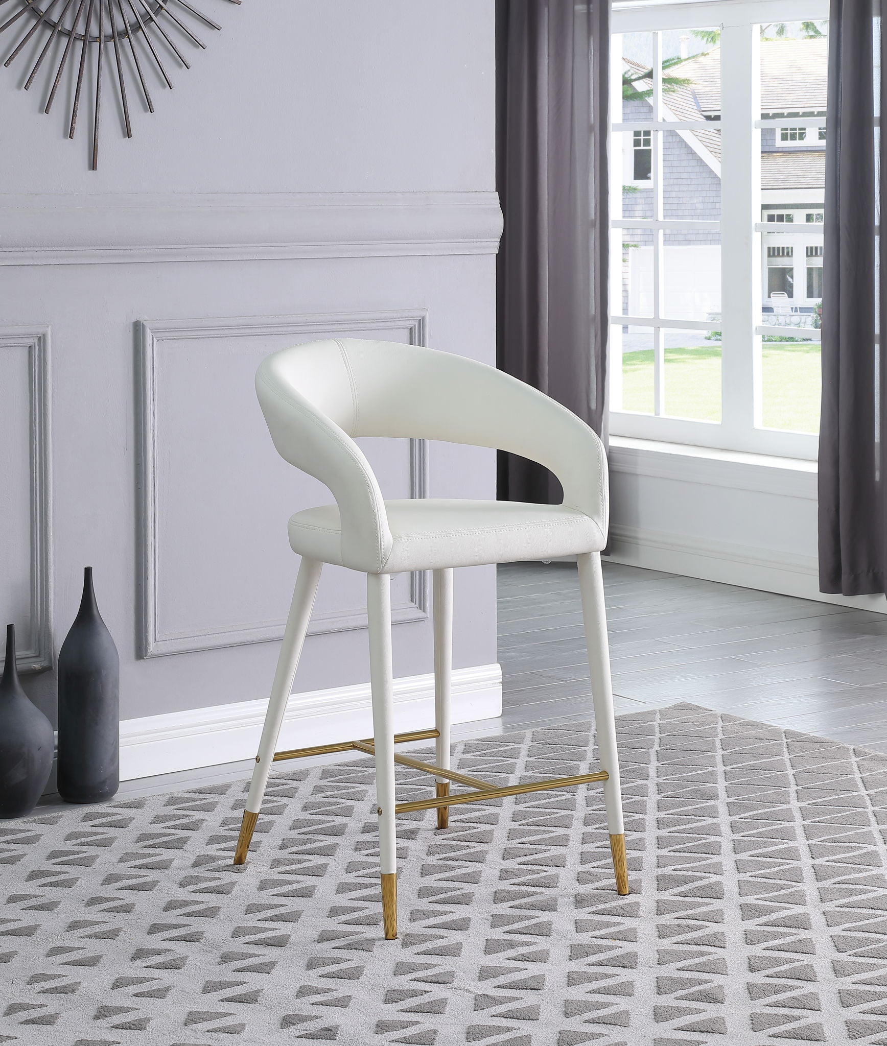 Settle in for a meal with friends seated in this Destiny stool. Soft upholstery makes this stool a sleek and inviting option for pairing with your favorite counter table. The rounded back adds comfort to mealtime and lends the stool a chic, eye-grabbing touch, while tapered legs topped with gold tips give the stool an elegant finish.