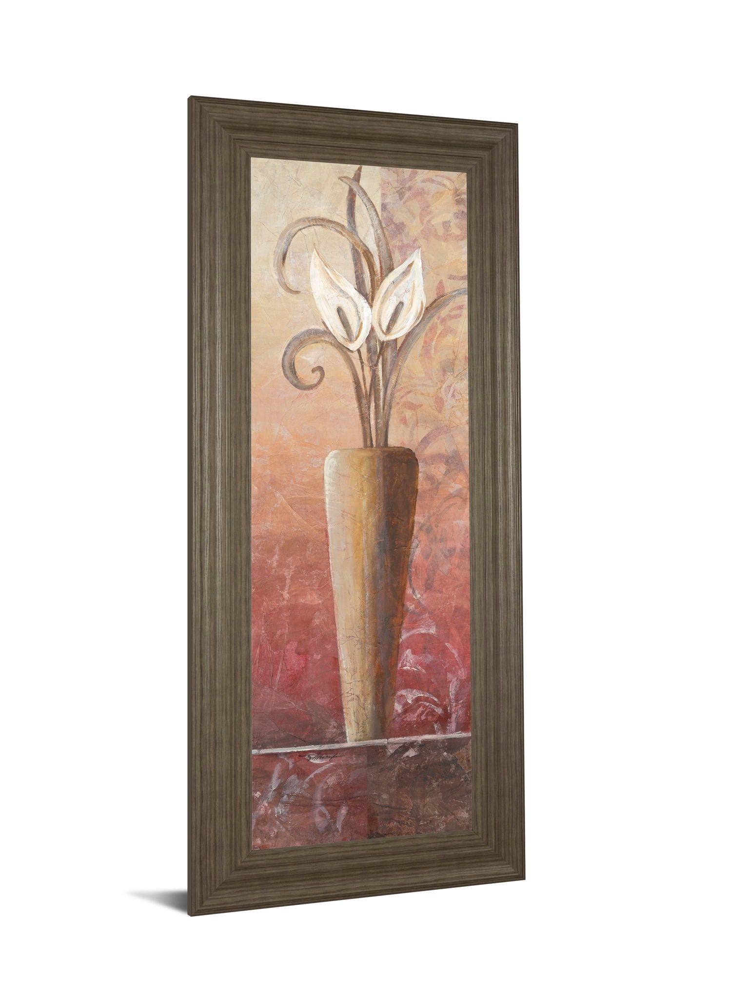 This captivating botanical artwork features an elegant tall vase holding delicate white blooms, set against a richly textured background of warm beige, brown, and soft pink hues. The tranquil ash finish frame complements the mixed media piece, enhancing its depth and timeless appeal. Protected by premium real glass, this vertical wall art brings a serene and sophisticated touch to living rooms or bedrooms, effortlessly elevating your home décor with its warm tones and graceful design.
