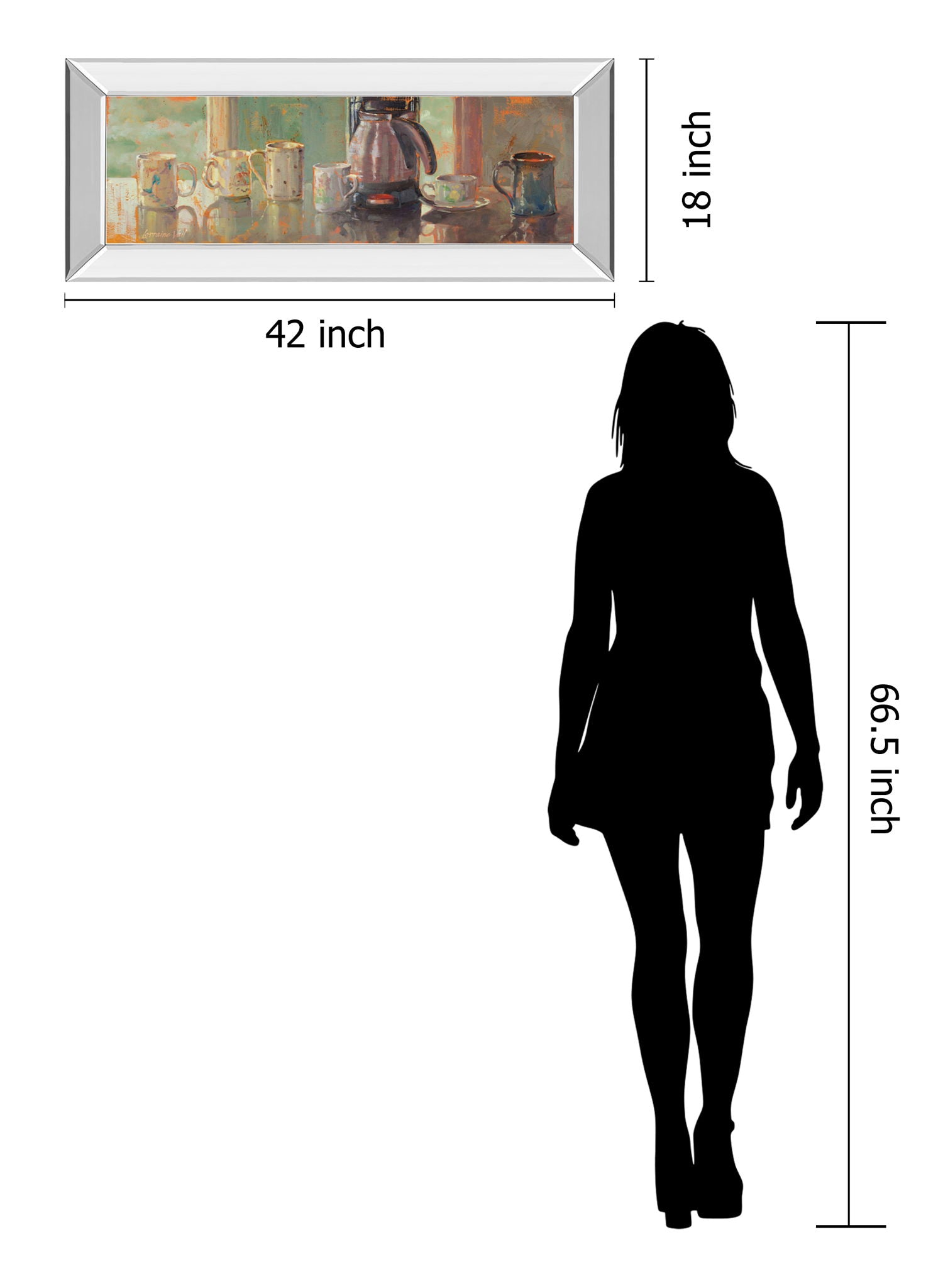 Step into a warm, inviting kitchen moment with this charming artwork that captures a collection of coffee mugs and a classic coffee pot resting on a reflective surface. The sleek mirrored frame adds a sophisticated touch, enhancing the depth and light in any kitchen or dining room. Protected by premium real glass, the vibrant mixed media colors bring life and texture to the piece, making it a perfect blend of comfort and elegance. Expertly crafted and ready to hang, this art invites you to savor the simple pleasures of a cozy gathering.