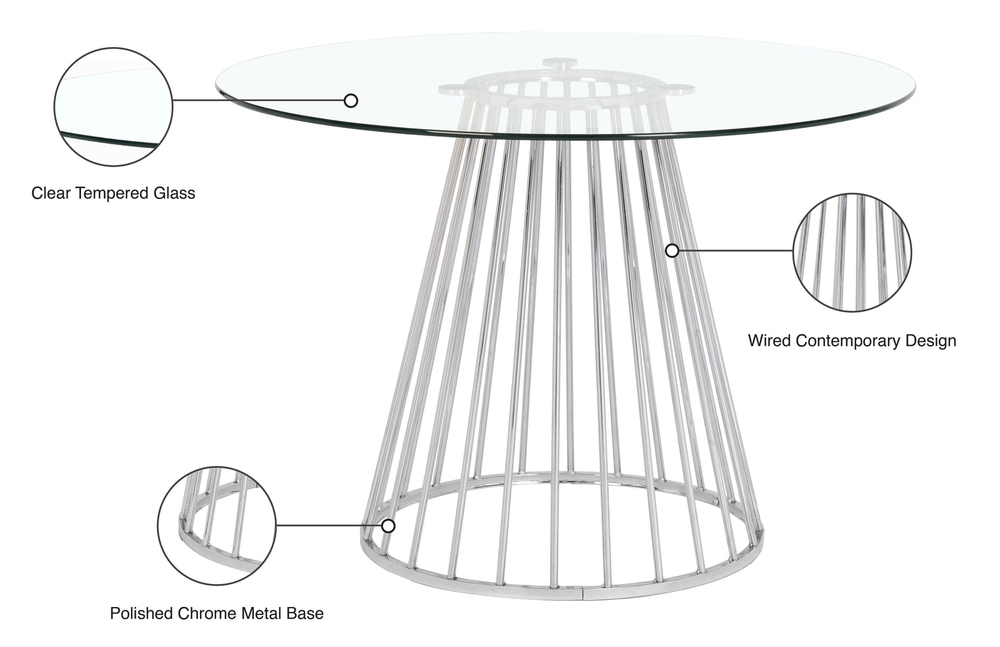 Add a bold touch to your dining area with this chic Gio dining table. Featuring a round, clear tempered glass tabletop and a polished metal base with a wired contemporary design, this dining table transforms your dining space into a stylish haven.