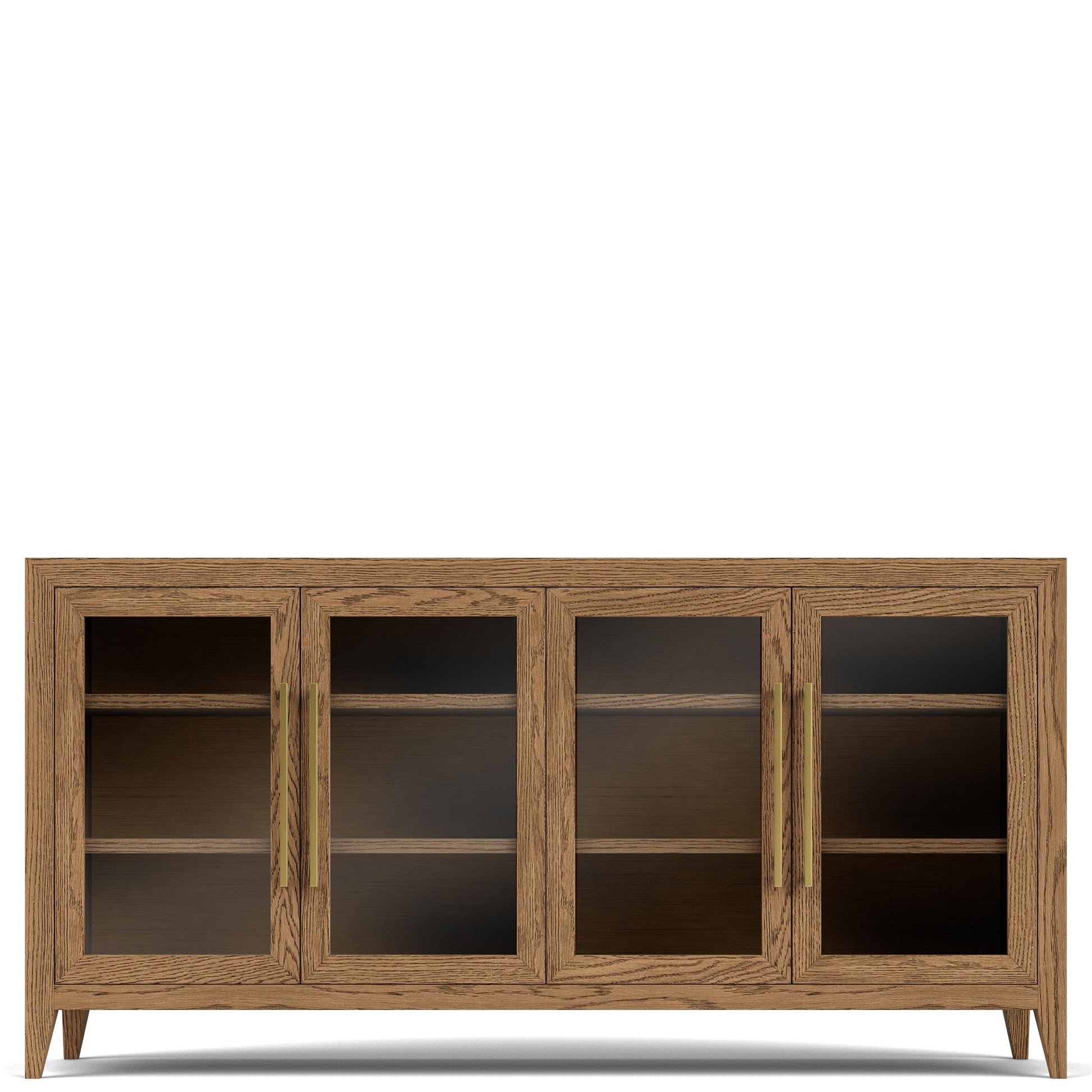- Two pairs of wood framed glass doors each enclose two adjustable wood framed glass shelves
