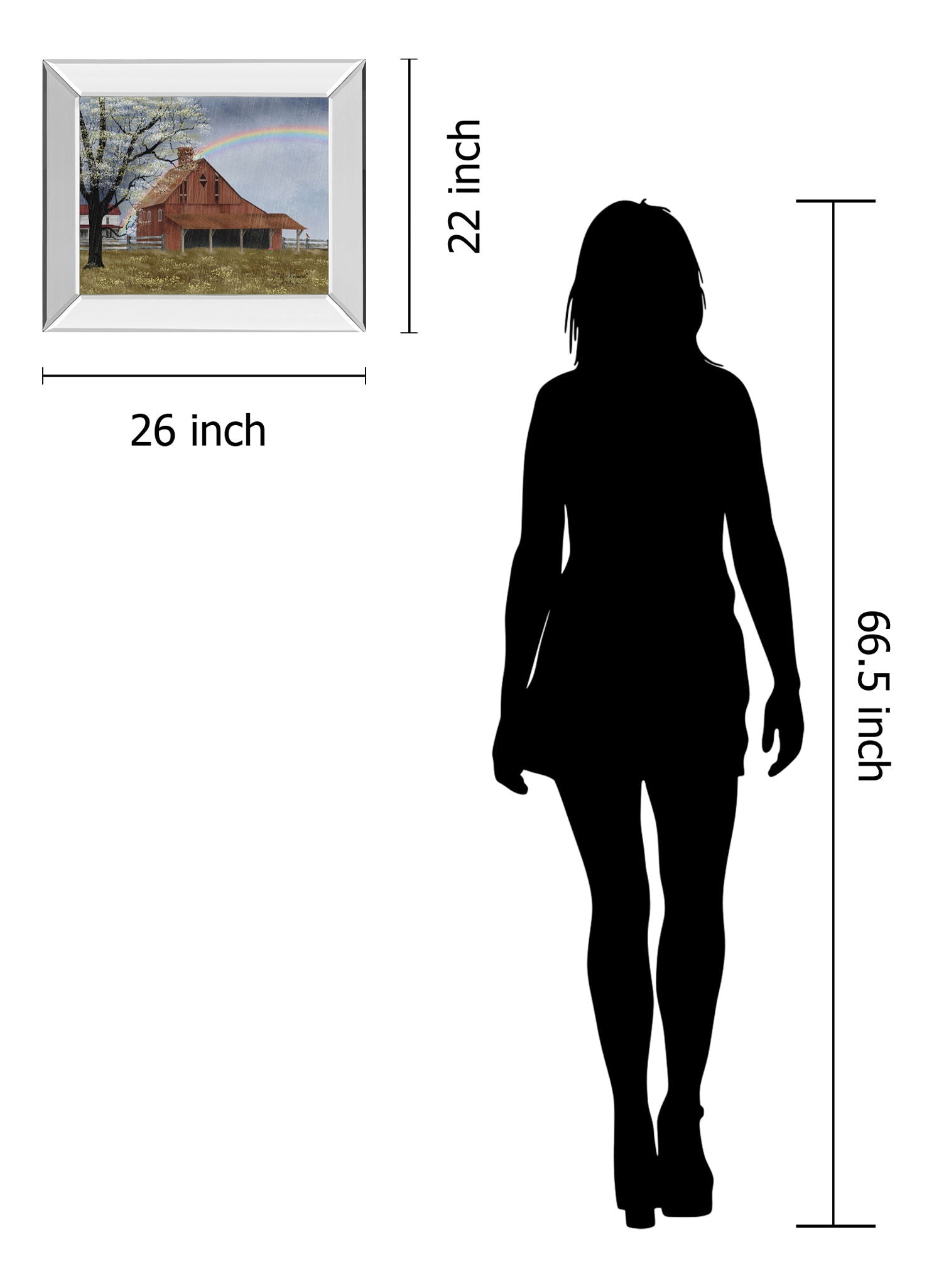 Step into a tranquil countryside scene where a weathered red barn stands strong beneath a soft spring rain, its roof sheltering memories of simpler times. A delicate tree in bloom and scattered wildflowers add gentle touches of life and hope, while a radiant rainbow arches gracefully across the muted gray sky, promising renewal and brighter days ahead. Framed in a sleek mirrored border, this piece blends rustic charm with modern elegance, making it a perfect addition to any living room or office seeking a peaceful, inspiring focal point.