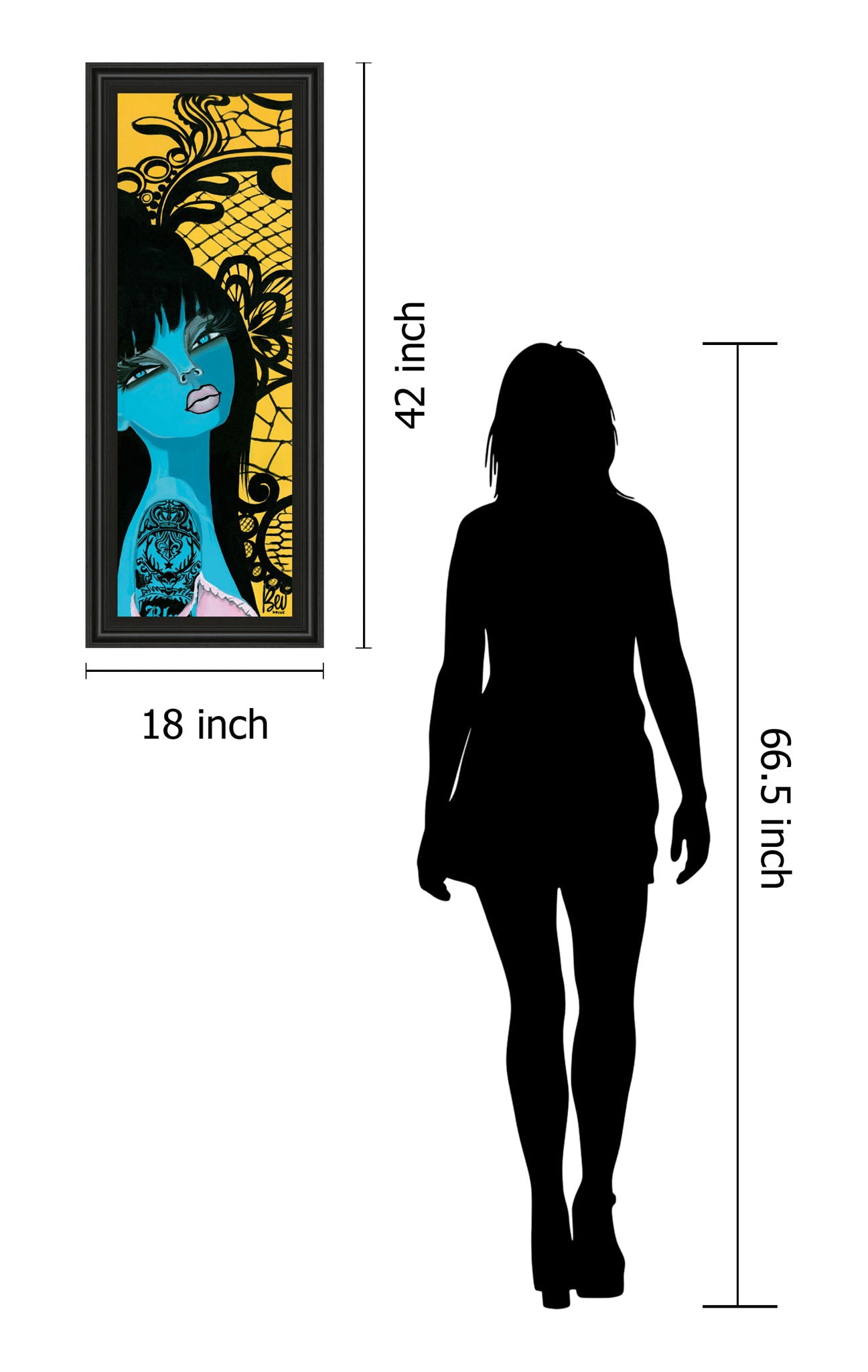 Ink Chiffon I draws you into a captivating world where bold blue hues meet intricate black tattoo designs against a radiant yellow background. This contemporary portrait features a stylized figure with an expressive gaze that evokes both mystery and emotion. Encased in a sleek midnight aura frame and protected by real glass, this mixed media piece blends elegance and modern edge, making it a striking addition to living rooms, bedrooms, or offices. Crafted with premium materials, it arrives ready to hang and instantly transforms any space with its unique color palette and artistic depth.