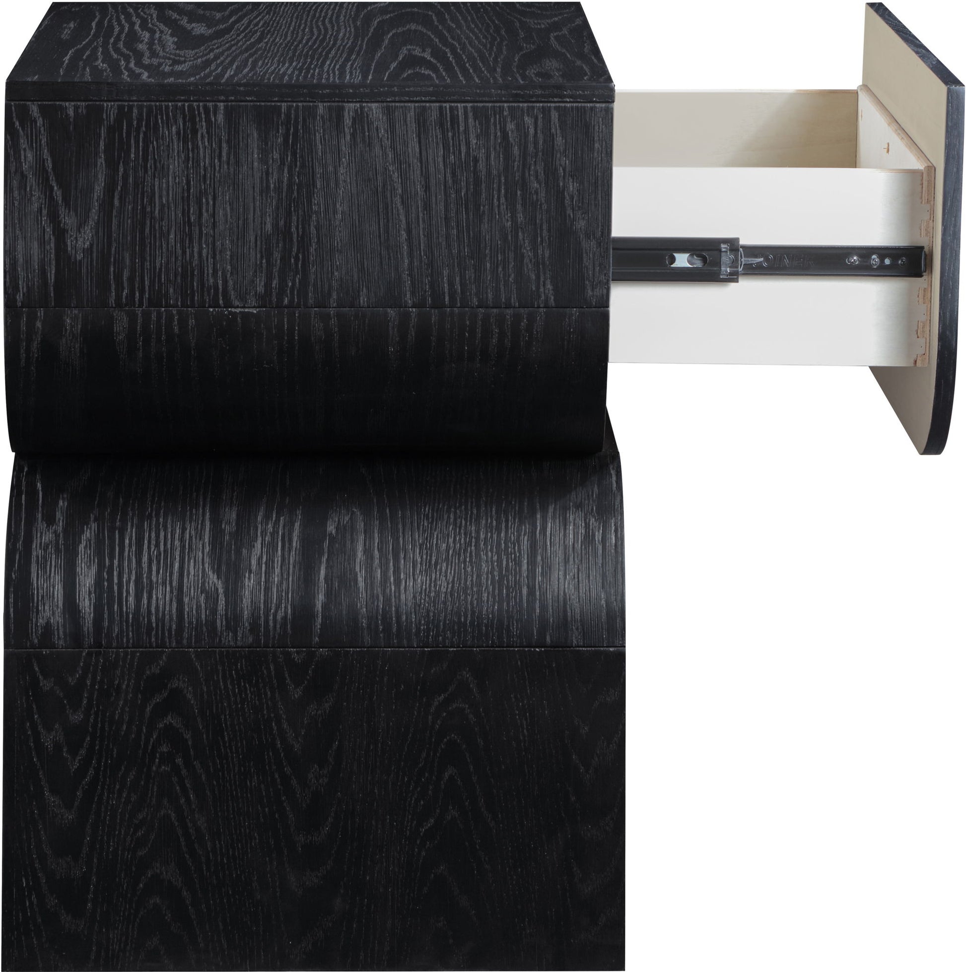 In the realm of modern design, the Jace oak veneer nightstand strikes as a captivating masterpiece. Its sleek lines and curved silhouette create a captivating interplay of light and shadow. The spacious drawer provides ample storage for your essentials, such as adding a basket to put underneath for books and other small items. The unique design adds a touch of personality to your bedroom.