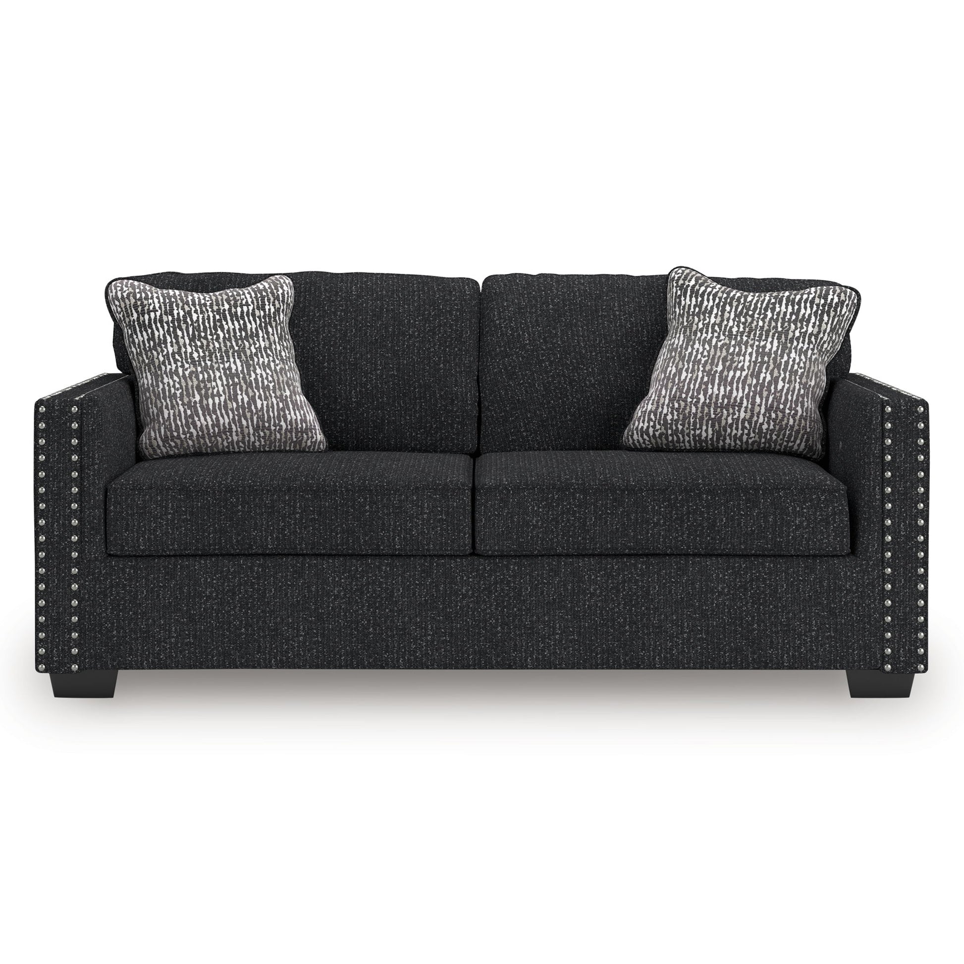 This stunning sofa leaves a lasting impression. Its cozy cushions, chic coal-colored upholstery and striking nailhead trim are a perfect blend of comfort and contemporary design. And here’s the showstopper—ambient red, white and blue LED lighting along the sofa's base. The look is simply wow.