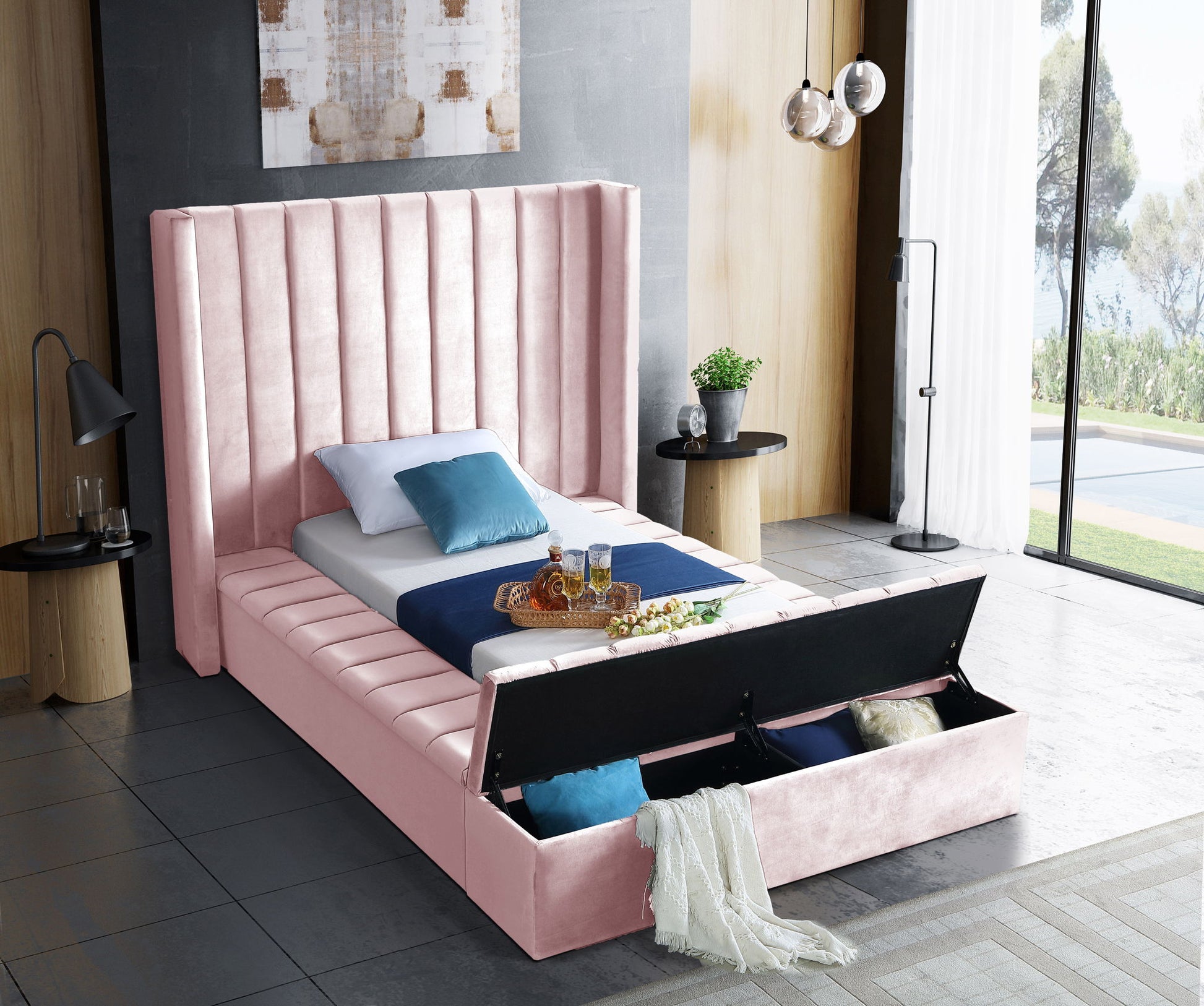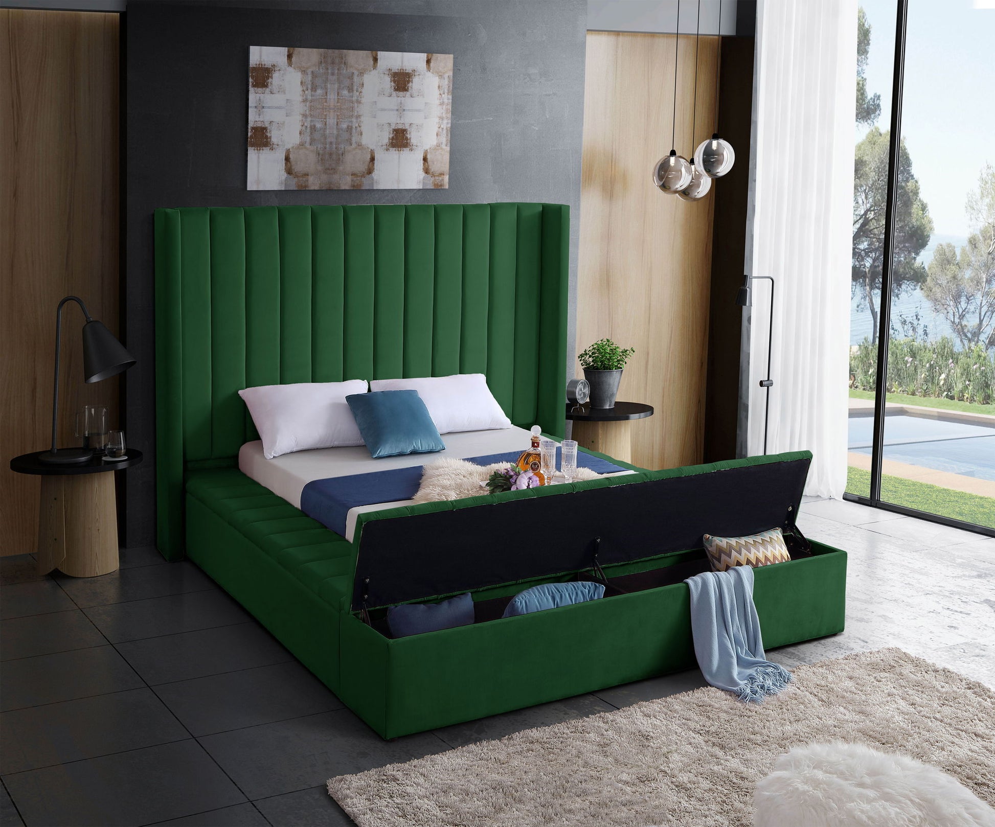 Make a bold statement in your bedroom with this stunning Kiki velvet bed. Its velvet design with channel tufting gives it a chic, textured appearance that's both comfortable and dramatic. This bed features storage rails along its slats frame, making it the perfect solution for individuals in limited sleeping spaces.