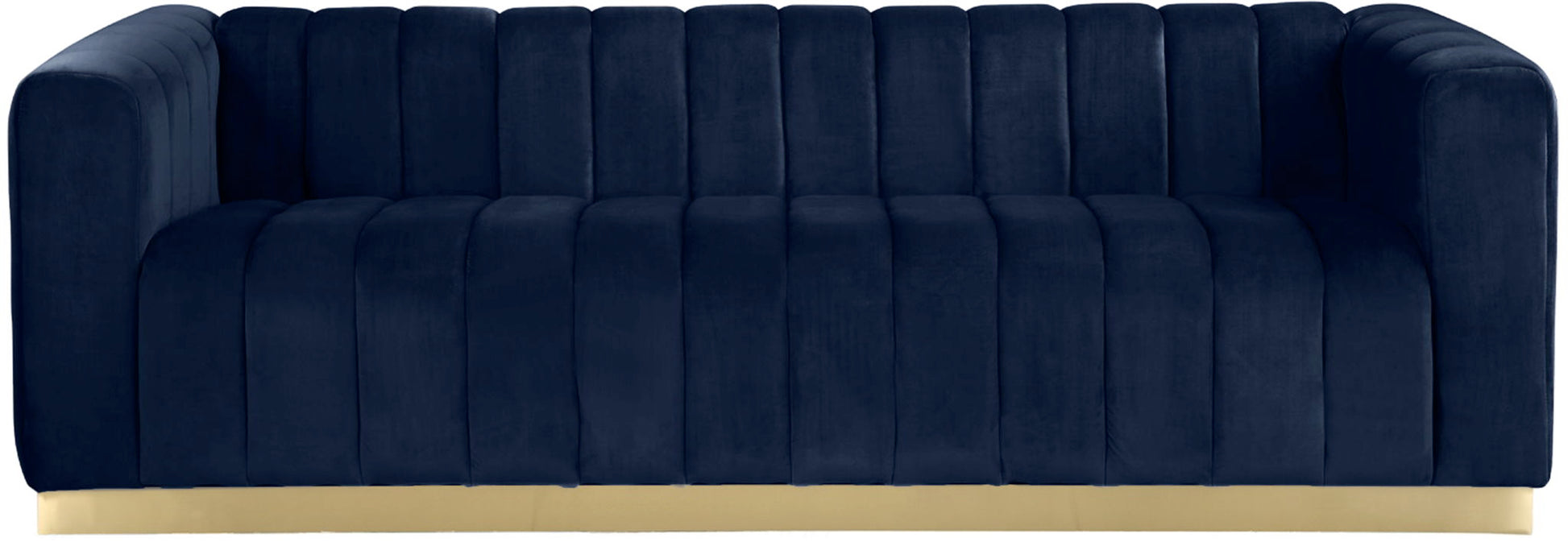 Seat guests in the epitome of comfort and style with this Marlon velvet sofa. This piece is just the thing to showcase your modish style while ensuring total enjoyment from all who are lucky enough to relax on its channel tufted seats. The soft velvet upholstery adds a beautiful touch to your space and feels great against your skin while the brushed gold stainless steel base lends it a contemporary finish.