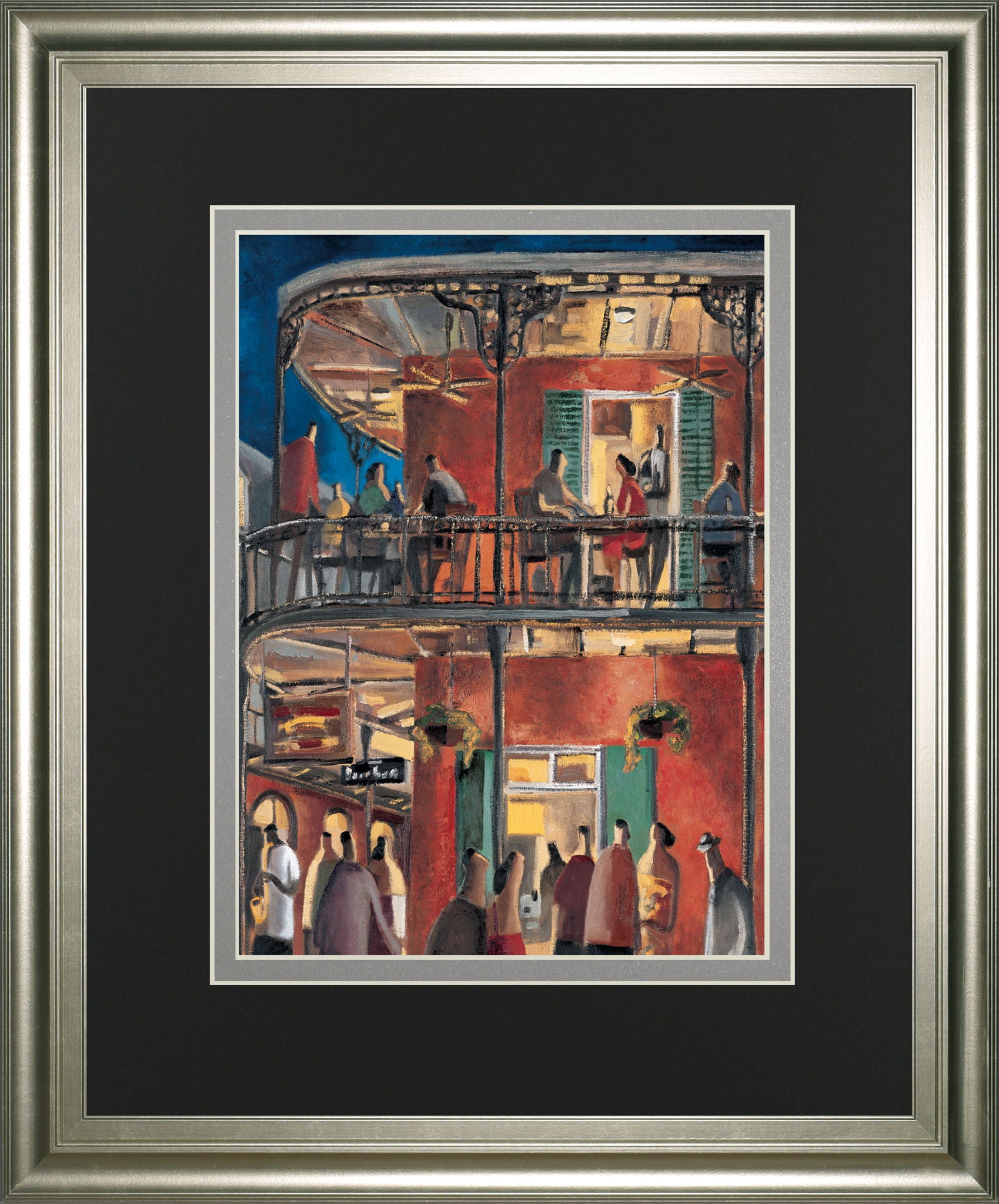Step into the lively streets of New Orleans with this captivating depiction of an evening scene filled with warmth and social energy. The artwork beautifully captures the essence of the city’s vibrant nightlife, showcasing figures gathered on balconies and bustling below, all rendered in a contemporary graphic style with rich reds, blues, and subtle earth tones. Framed in a sophisticated silver frame with double matting and premium real glass, this piece brings a touch of urban charm and cultural richness to your living room, dining room, or den, inviting you to experience the spirit of New Orleans every day.