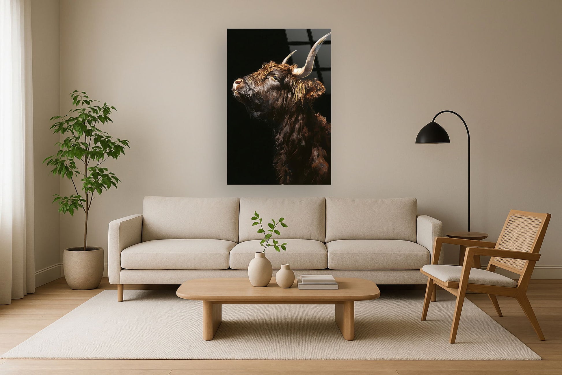 Capture the essence of the wild with this striking portrait of a Highland bull. The detailed photograph on tempered glass brings out the rich textures and earthy tones, making it a captivating centerpiece. Perfect for adding a touch of rustic charm to any room.