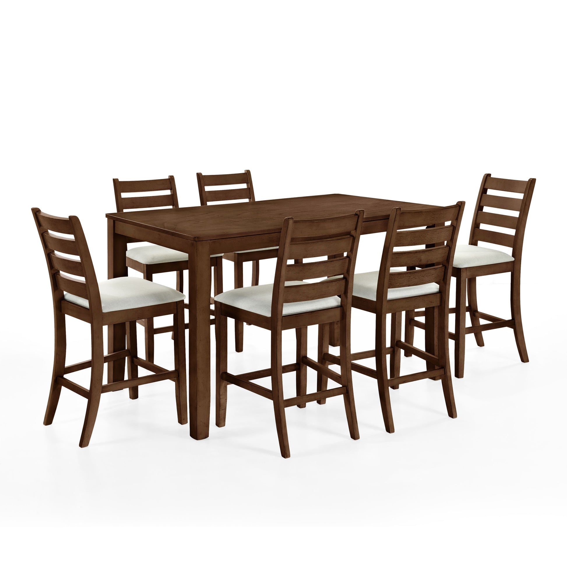Discover the Pascal Counter Height Dining Room Set in warm finish, featuring a wood counter dining table and counter chairs. This set is crafted from a durable combination of solid Rubberwood and manufactured woods, ensuring long-lasting quality. Each solid wood chair includes four base stretchers, providing extra stability and support. The Pascal set boasts a rich, sophisticated finish, achieved through a meticulous multi-step process that highrichs the natural beauty of the wood with rub-throughs and glazing. Each chair is designed for comfort, featuring high-density foam cushions covered in easy-care 100% polyester fabric.The 60-inch counter table offers roomy dining for six, making it an ideal gathering spot for both dinner and game nights. The versatile design, with subtly rounded edges, tapered legs, and ladderback style chairs, fits seamlessly into transitional, farmhouse, and contemporary decor styles. Combining comfort and elegance, the Pascal set enhances any dining space with its timeless appeal.