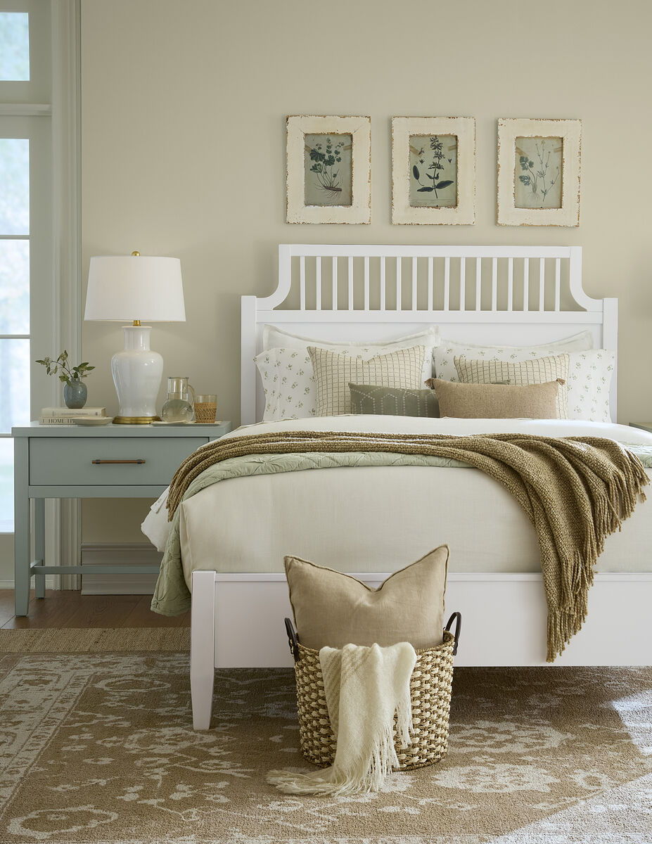 The Garden Bed with its tall headboard adds grace; while the crisp white finish reflects light and creates a calming feel. Paired with soft sage accents; it balances fresh modern design with timeless cottage character; inviting relaxed; restorative nights.