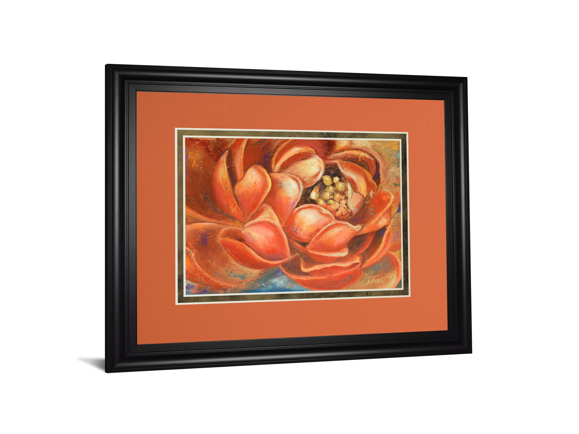 Immerse yourself in the warm glow of this Radiant Bloom artwork, where rich oranges and subtle earth tones create a captivating botanical scene. The mixed media composition brings texture and depth to the vibrant petals, drawing the eye into the heart of the flower. Framed in a sleek midnight aura finish with double matting in complementary hues, this piece offers a polished, gallery-style presence that enhances living rooms, bedrooms, or offices. Protected by premium real glass and ready to hang, it invites a timeless elegance and a burst of color that enlivens any space with natural beauty and sophisticated charm.