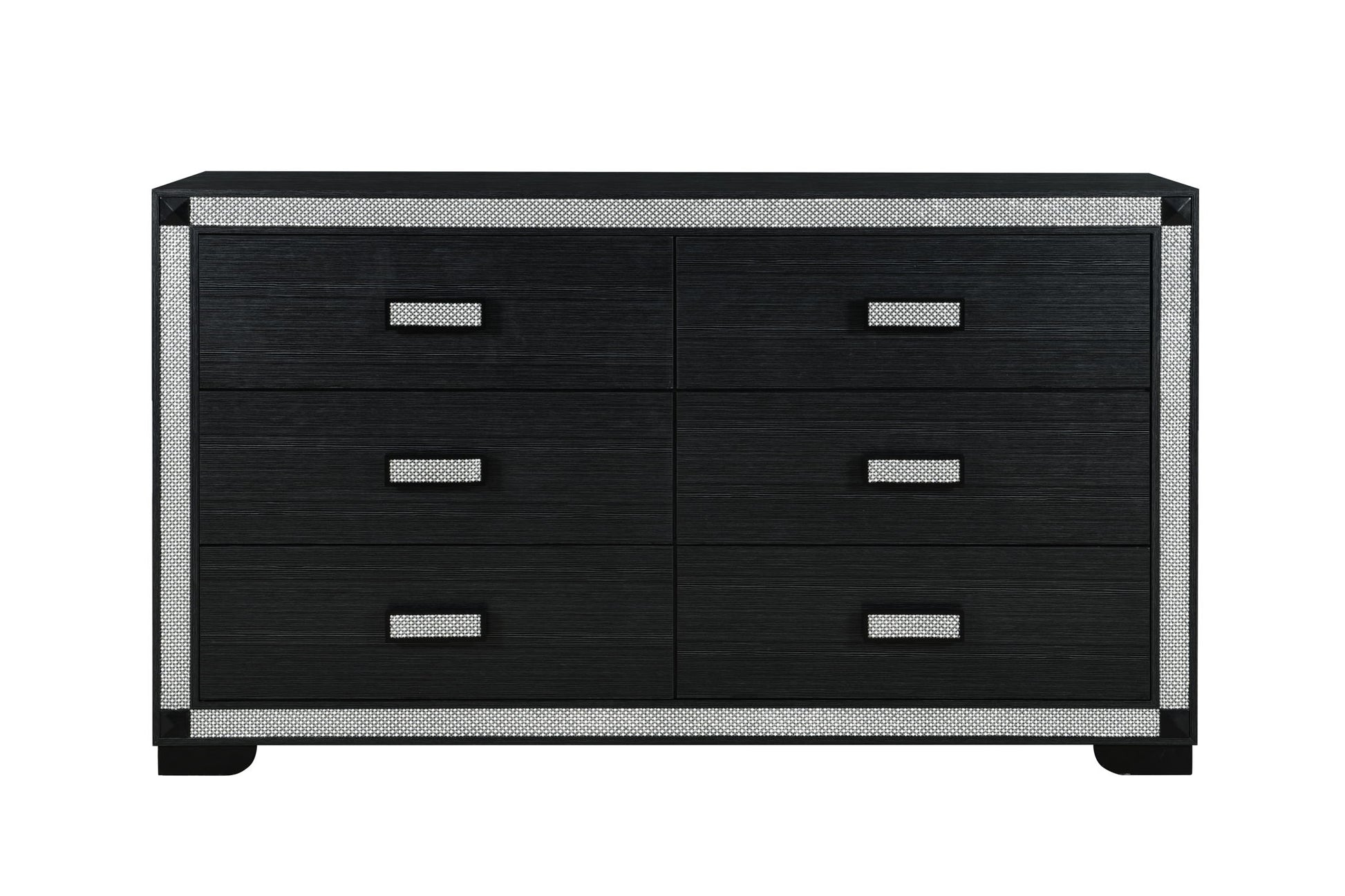 The Soleil Dresser offers both beauty and function. Its dark charcoal finish is wrapped with crushed crystal trim that catches the light beautifully, while its spacious drawers provide ample storage. Crystal-accented handles complete the look, making this piece as practical as it is dazzling.
