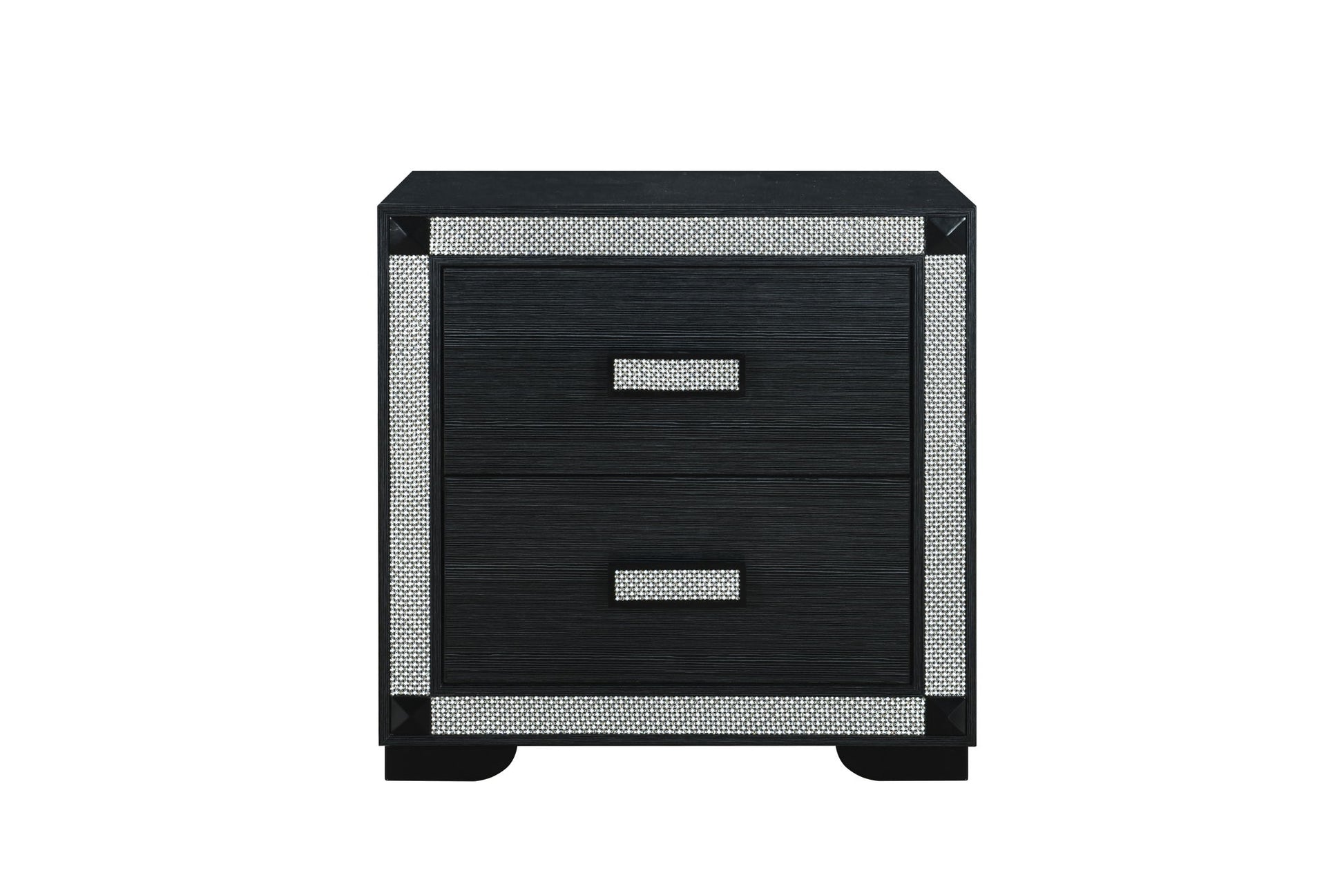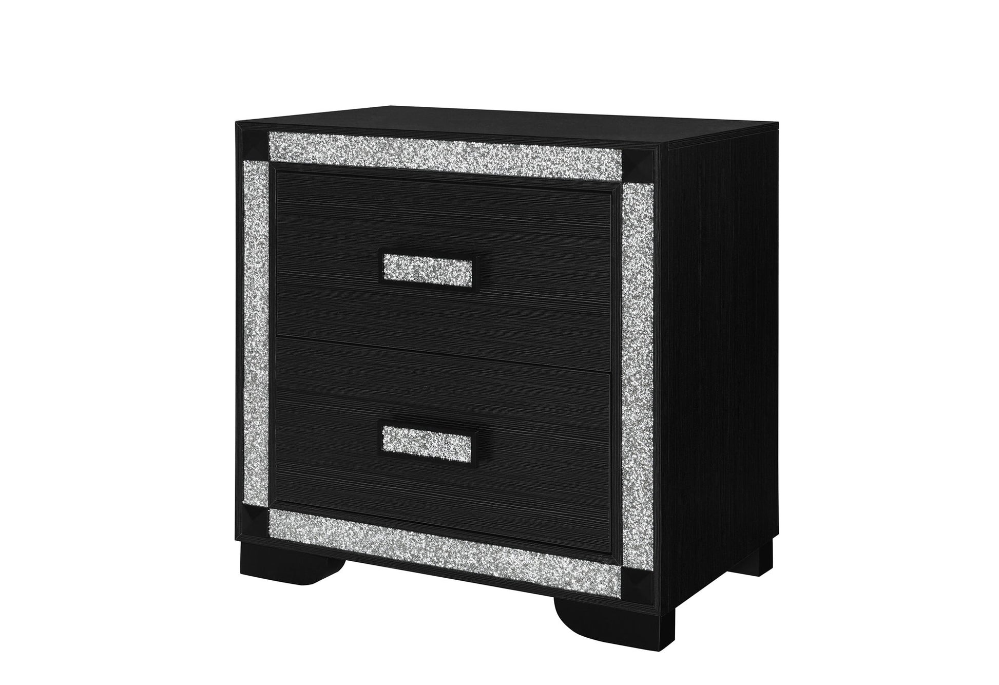 The Soleil Nightstand is a chic companion for your bedside. Its compact design offers two roomy drawers for convenient storage, framed by sparkling crushed crystal trim and accented with crystal handles. A perfect blend of practicality and style.