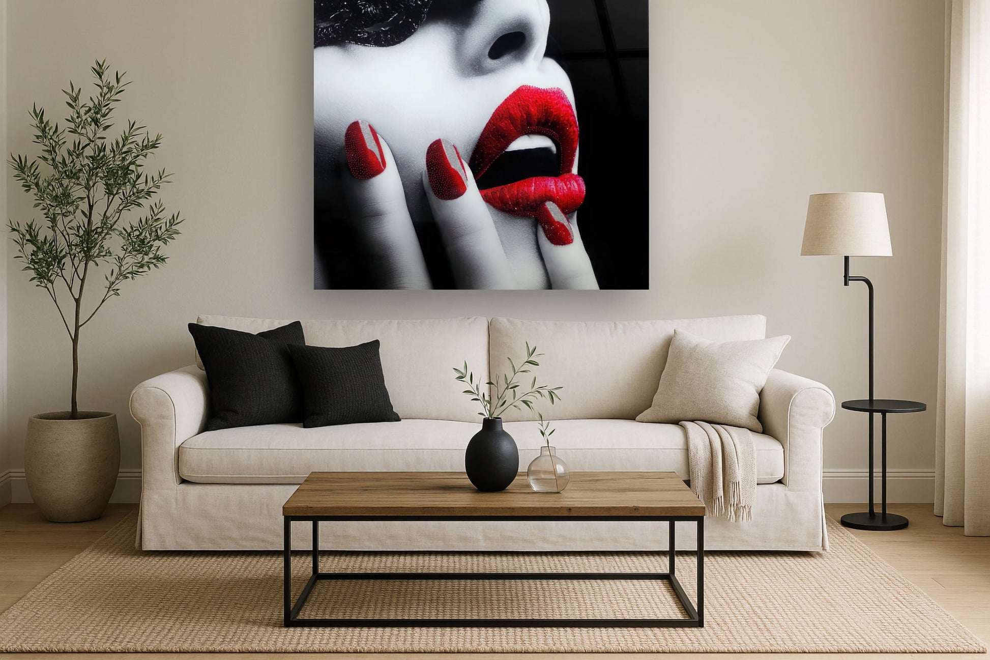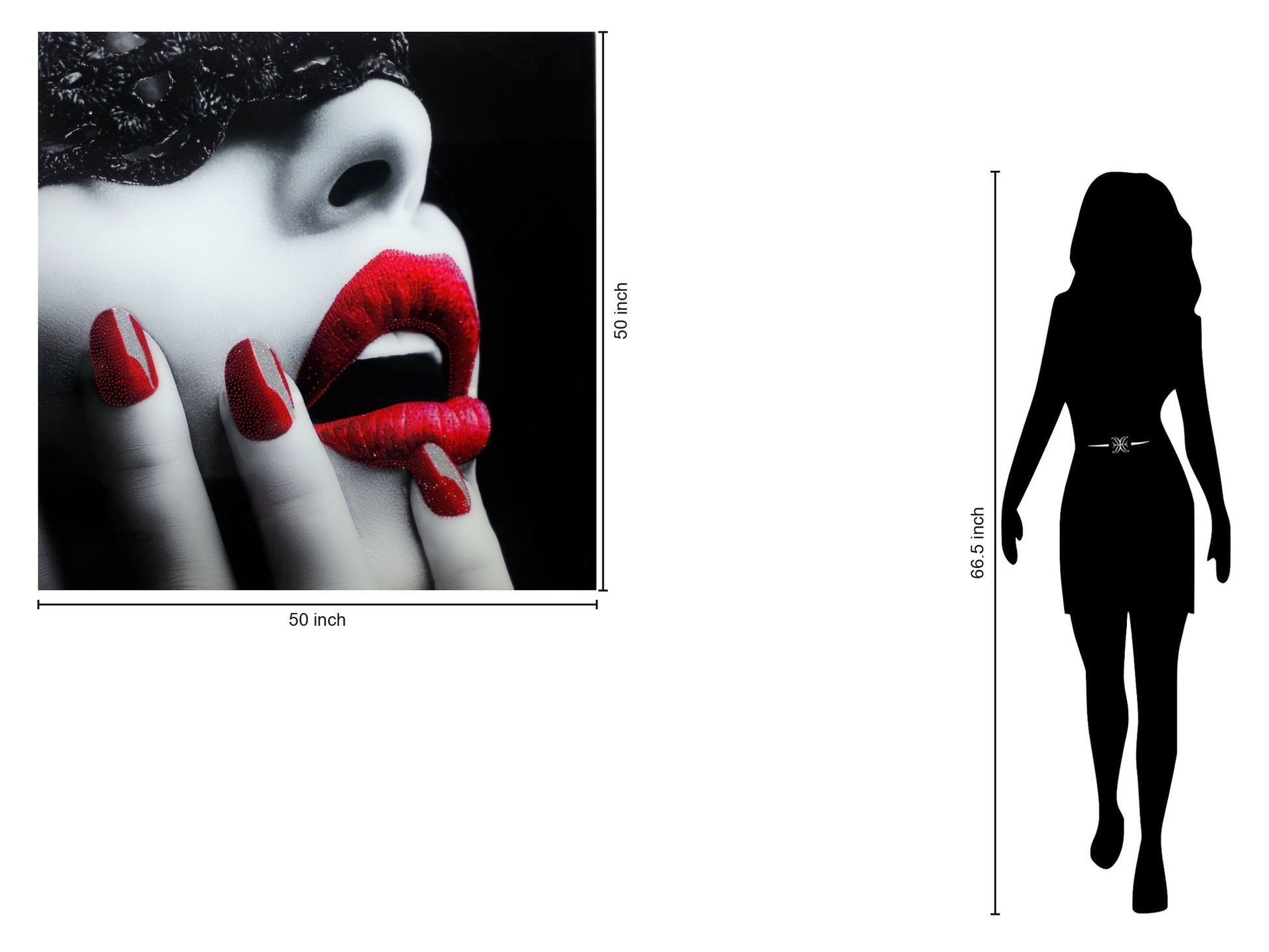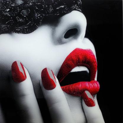 Discover the captivating allure of "Lace Lips Statement Rhinestones," a contemporary wall art piece that masterfully blends photography with hand-embellished rhinestones beneath tempered glass. This striking artwork features a close-up of lips and fingers adorned with vivid red rhinestones, creating a bold contrast against the monochrome background. Crafted with durable tempered glass, it offers a sleek, dimensional finish that adds depth and shine to any living room, bedroom, or office. Ready to hang with angled sawtooth hangers, this piece not only elevates your space but also supports a social cause by donating a meal to a hungry American child with each purchase.