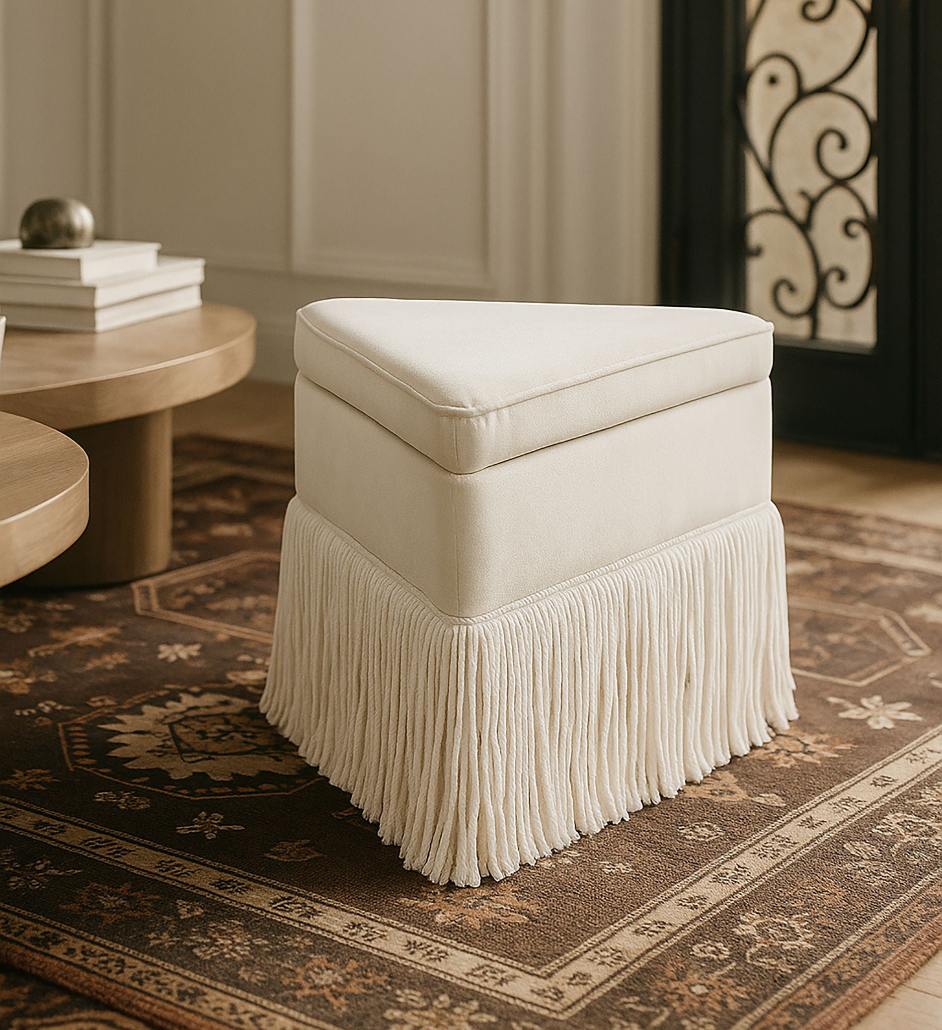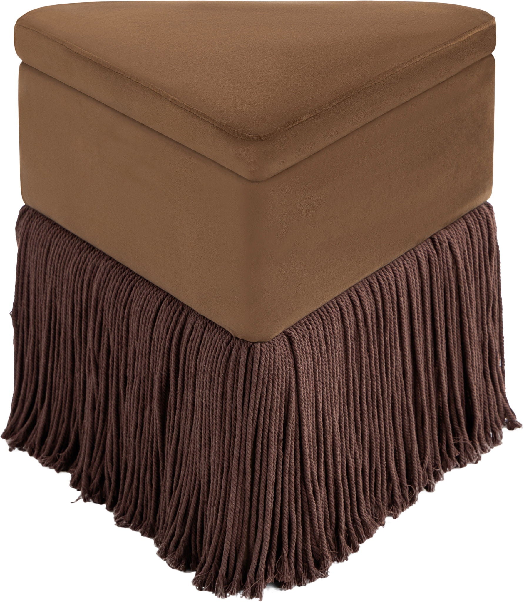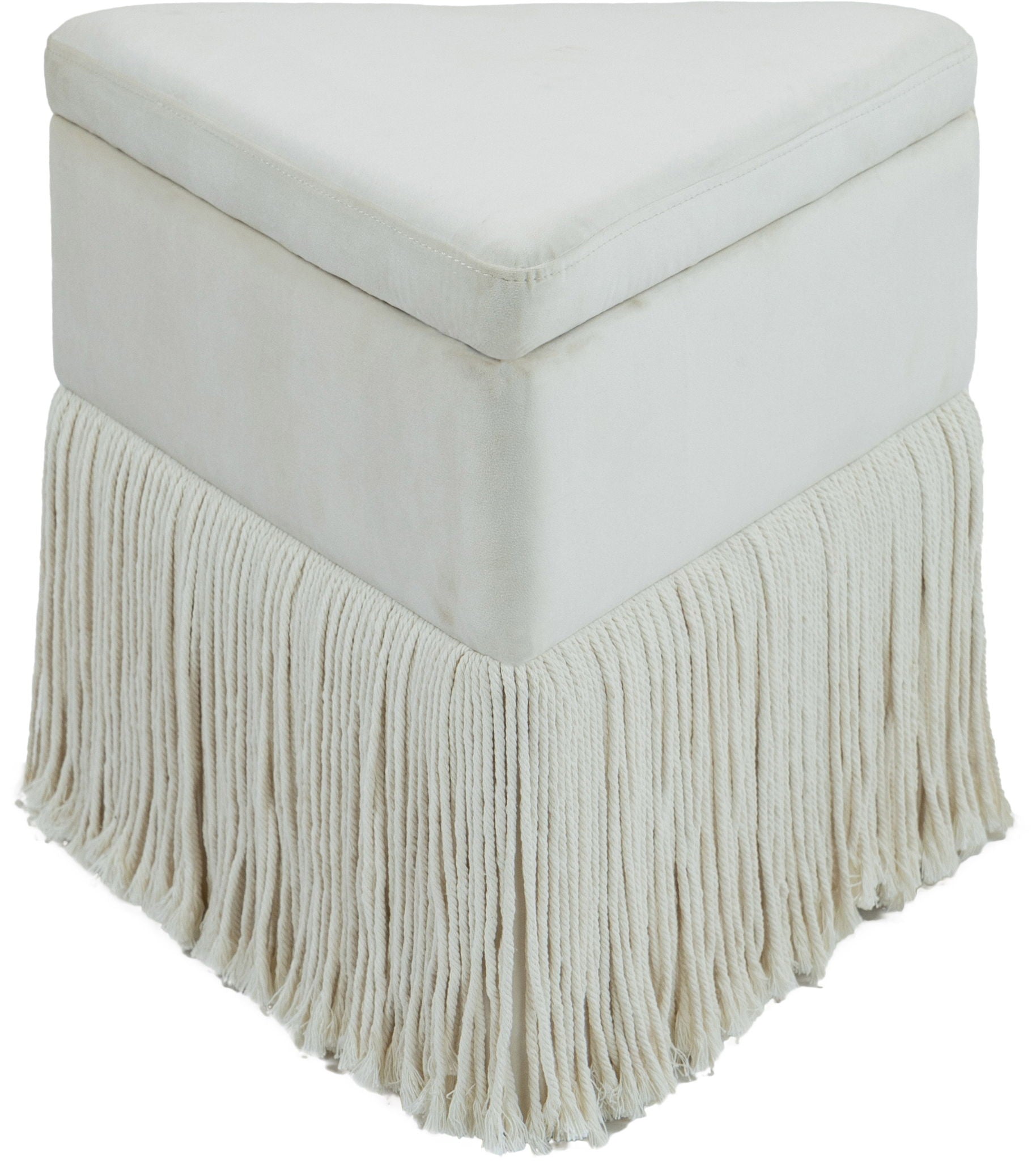 Add a bold touch of luxury to your space with the Trivoli velvet ottoman, a captivating piece that combines opulence with quirky flair. Draped in sumptuous velvet, this triangular stool is all about making a statement. Its dramatic fringe skirt adds both texture and movement, offering a playful yet elegant vibe.