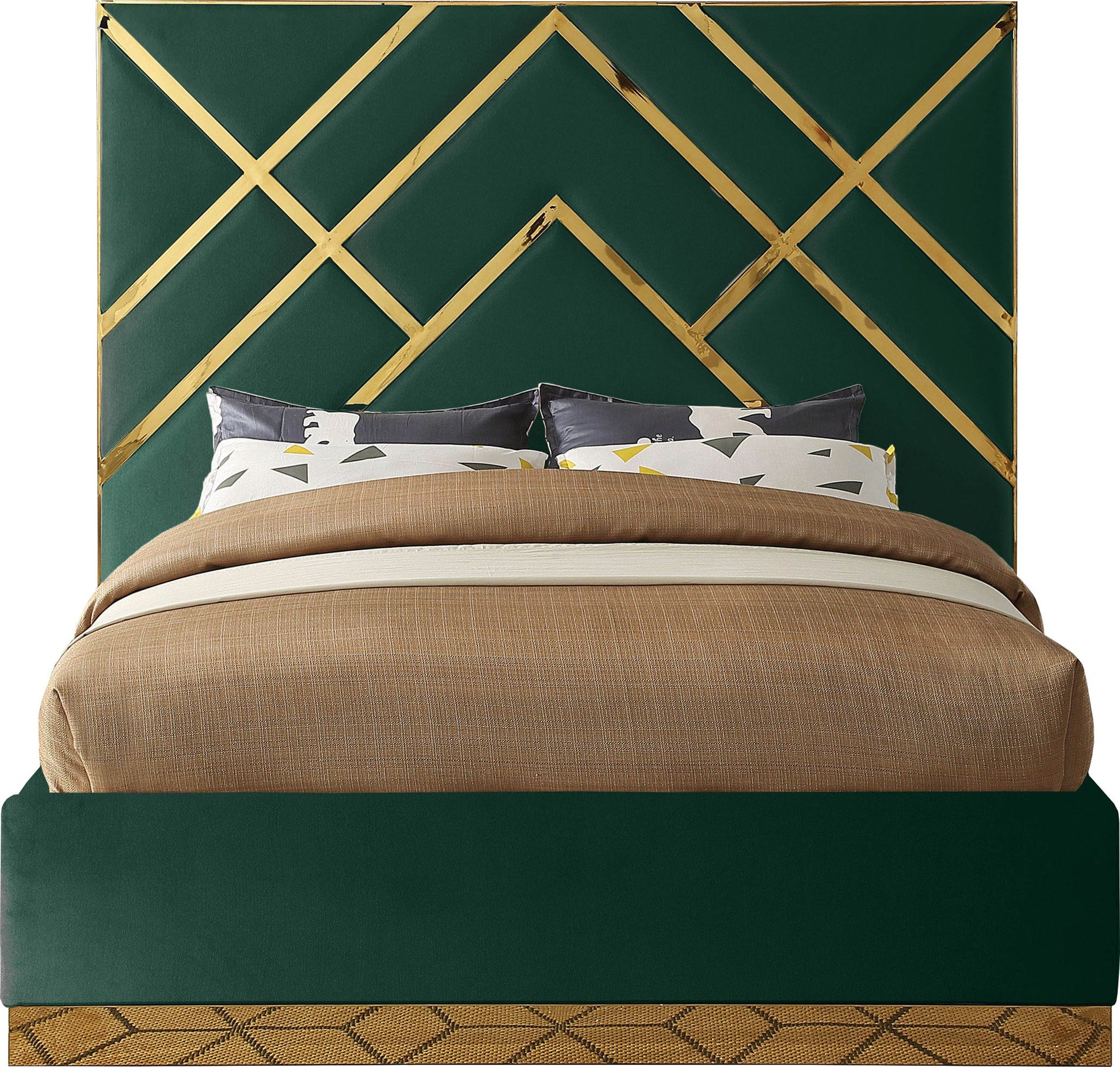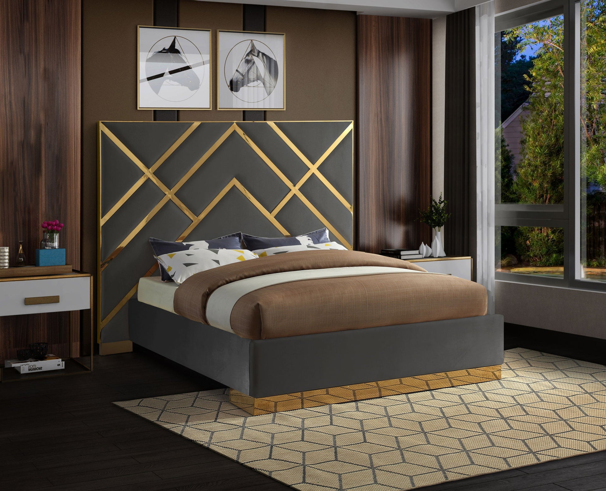 Take your bedroom space to a whole new modern level with this Vector velvet bed. Posh velvet upholstery in a lovely color is intersected by polished metal in a geometric design that is nothing short of spectacular. This stunning bed has a metal base to finish off the presentation on a glamorous and upscale note. slats are included with the bed to help provide support for your mattress, and the platform footprint ensures you need no box springs or foundation to recreate this look at home.