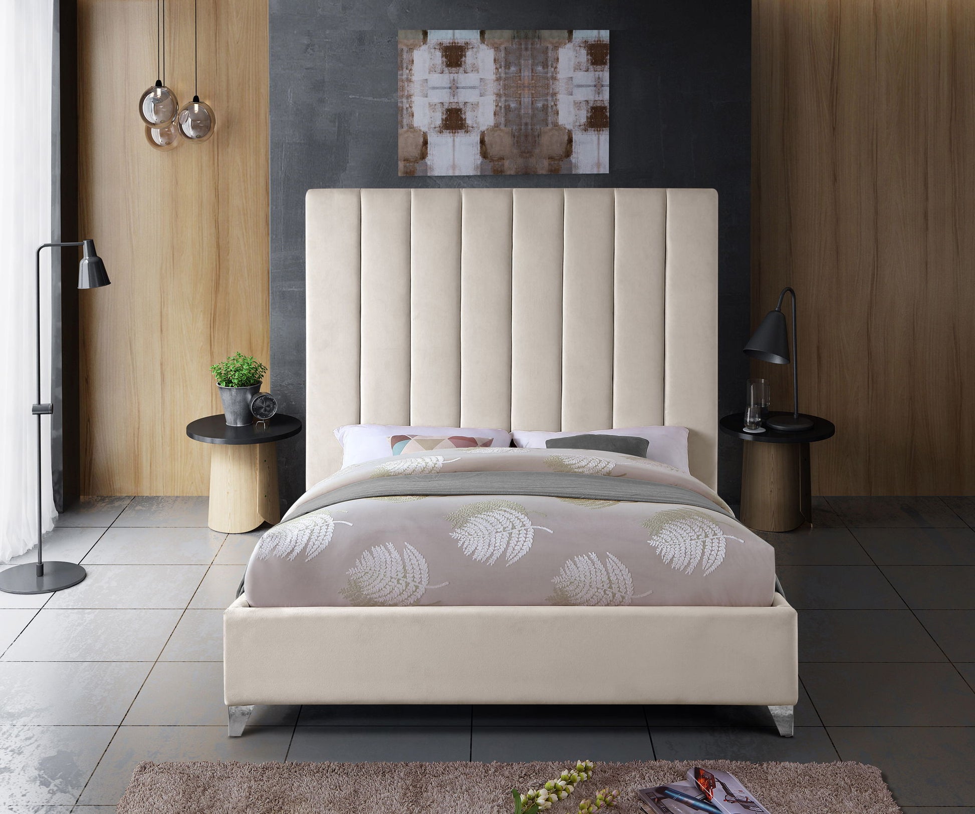 Take the look of your bedroom to new decorative heights with this ultra-modern Via upholstered bed. Sleek velvet upholstery gives this bed a true upscale feel and epitomizes fine living while channel tufting along the headboard keeps the padded material inside plump and aloft, so it cradles your body while you sit up in bed to watch TV or read. Metal legs bring this platform bed up off the floor, allowing clearance below for cleaning and adding to its svelte contemporary profile.